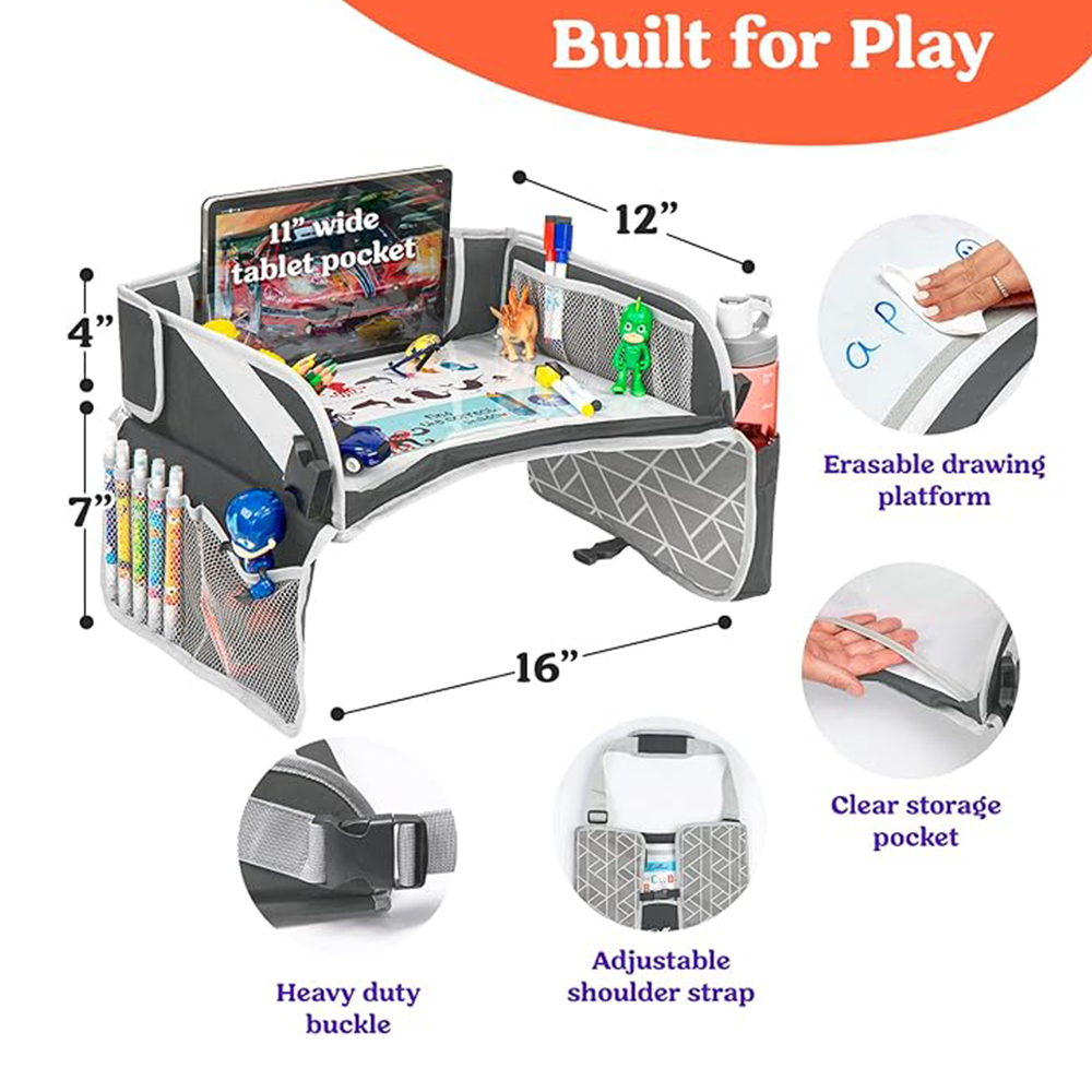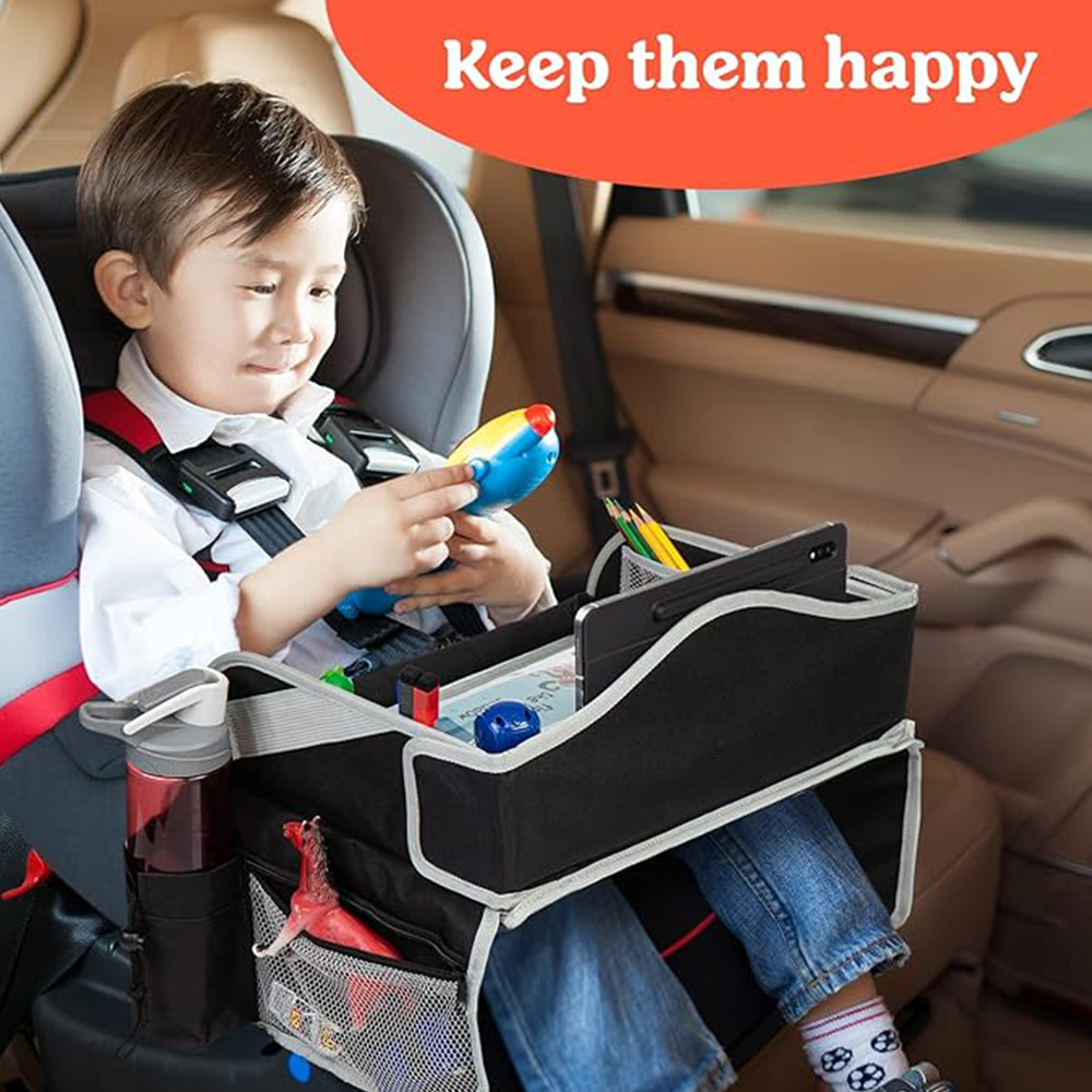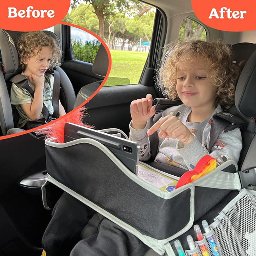 The car seat organizer tray is a portable solution designed to keep kids’ essentials organized while providing a convenient surface for travel activities.