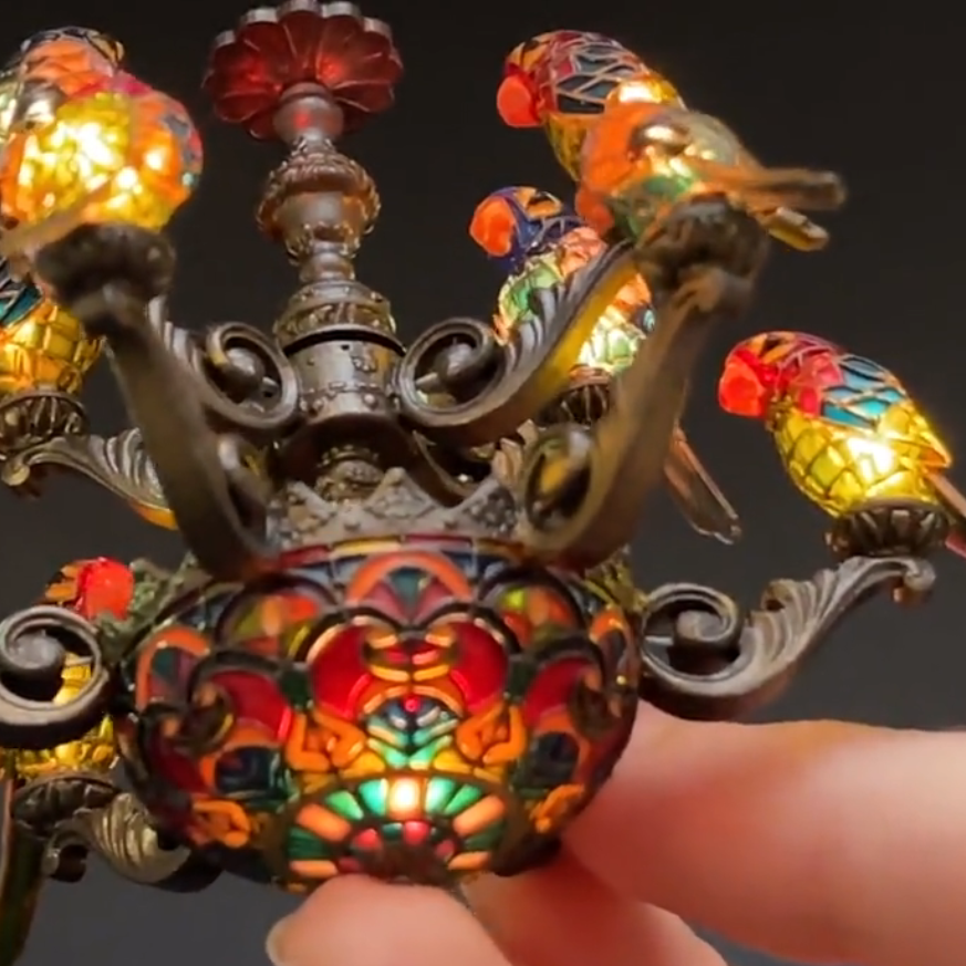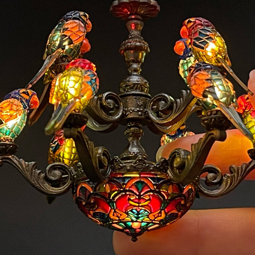 Miniature chandelier for dollhouses. Features two-tier design with adorable parrot details – a stunning tiny replica of Tiffany-style craftsmanship.