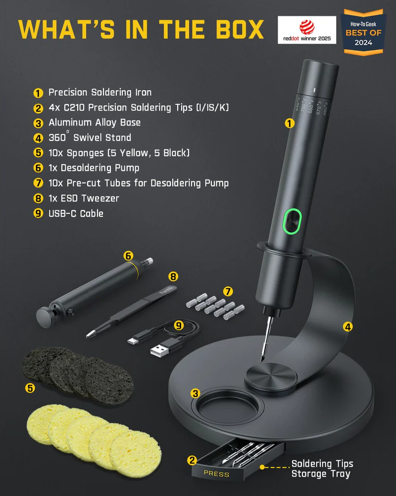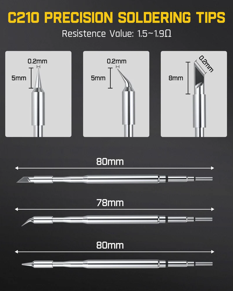 Includes four durable C210 soldering tips (C210-I, C210-IS, and two C210-K tips) with strong oxidation resistance and long service life. Heats up in approximately 7 seconds for faster workflow.