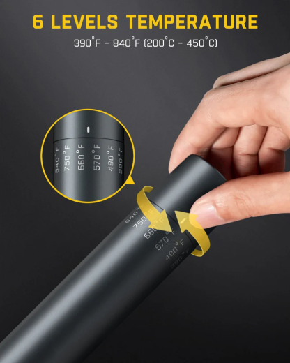 Rear control knob provides 6 adjustable temperature levels ranging from 200°C to 450°C (390°F to 840°F), allowing accurate control for different soldering tasks and heat-sensitive components.