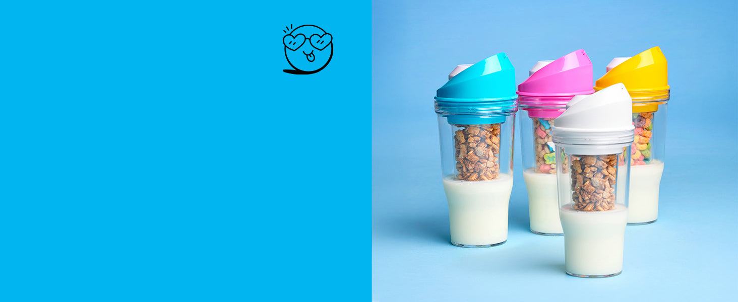 Made of two separate cups—one for cereal and one for milk—ensuring the cereal and milk don’t mix until you’re ready to eat. No spoon required, just enjoy your cereal with one hand wherever you are.