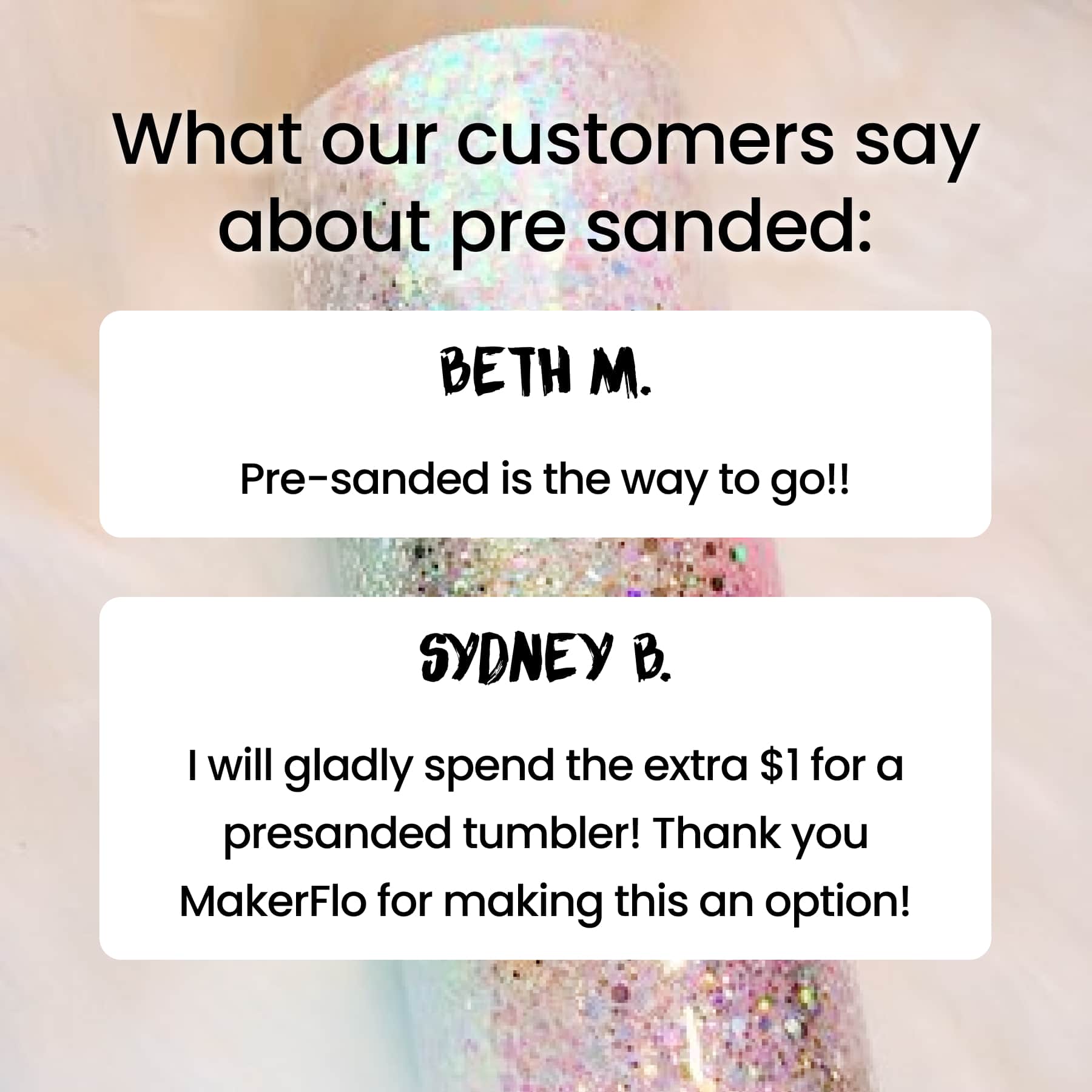 Pre-Sanded tumblers that are ready for customization! These tumblers are pre-sanded to save you valuable prep time. It may be best to use these tumblers for glitter tumblers or other methods that require heavier materials to coat the surface. We would not recommend purchasing these tumblers if you plan to do flat colors.