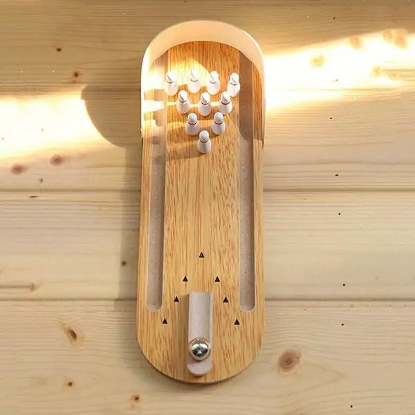 • Desktop Wooden Mini Bowling Game Set × 1 (includes ramp, 10 pins, bowling ball)