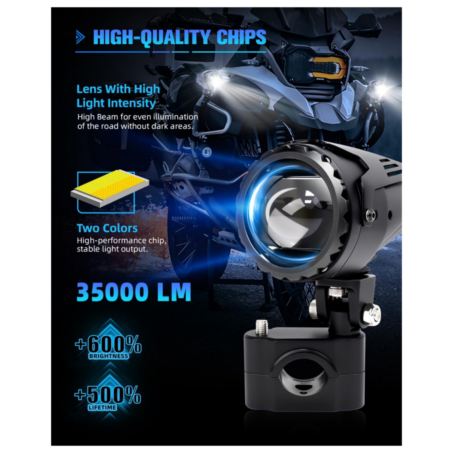 • High-intensity beam optical system: This motorcycle auxiliary light is equipped with high-intensity optical lenses and high-quality chips, providing a focused beam of 60W (35,000 lumens) with excellent clarity. The 360° balanced beam projection enhances visibility in conditions such as dark roads, rainy nights or foggy days, ensuring cycling safety and avoiding glare and scattering.